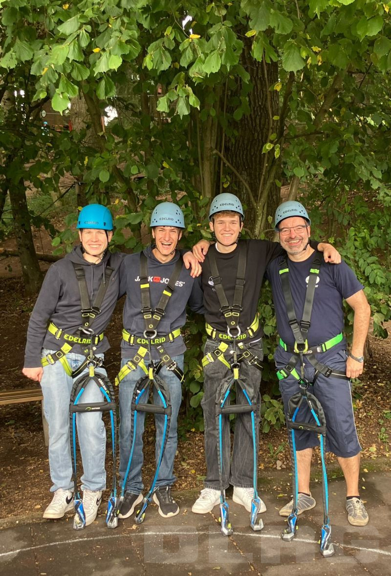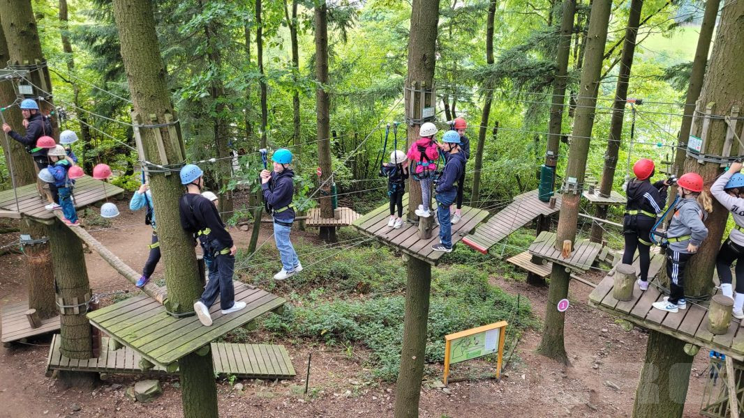 Die Kletterelemente führten in Höhen von 1 bis 14 Metern und boten mit Netzen, Seilen, Schaukelbrettern und anderen Hindernissen jede Menge Abwechslung und Nervenkitzel. Besonders begeistert waren die Kinder von den beiden langen Seilrutschen – über 100 Meter rasten sie, gut gesichert, durch die Luft.